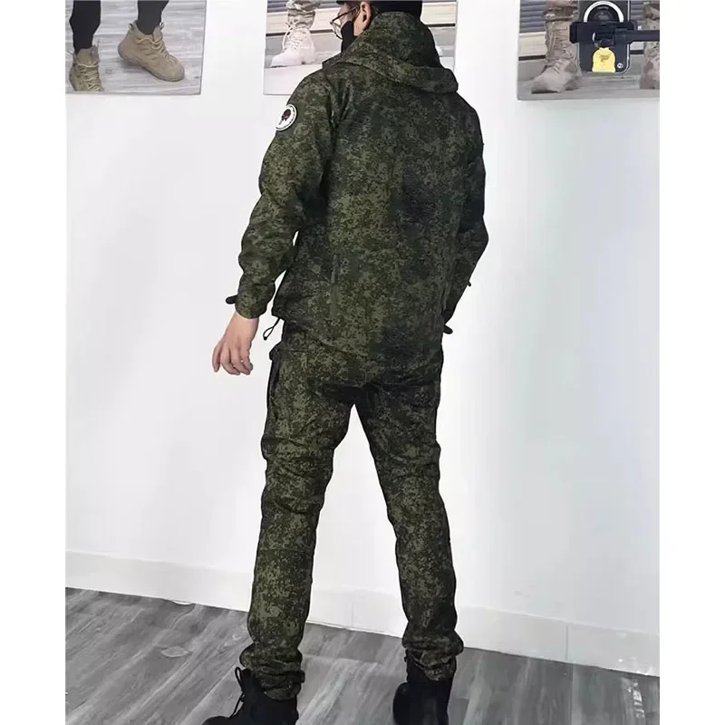 Black Camo 3 Pcs Sets Men Army Soft Shell Hooded Jacket+Breathable Long Sleeve Tshirts+Multi-pocket Straight Pants Cargo Suits